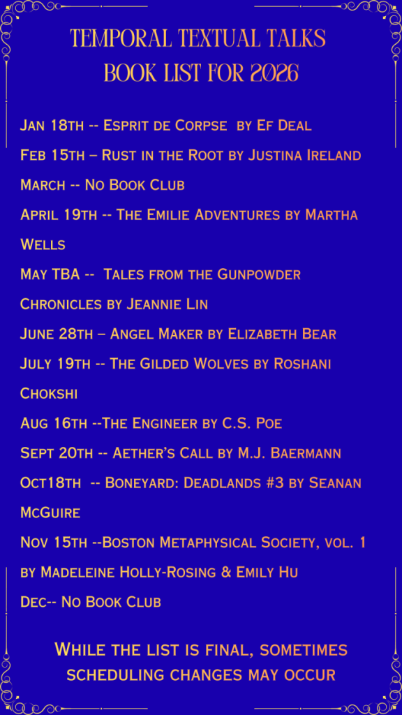 Many of my readers are already aware that I help administer a monthly book chat. For those that don’t, the Steampunk Virtual Book Chat (More formally known as Temporal Textual Talks) exists to help promote steampunk and steampunk-adjacent books and their authors. It started as a response to the global pandemic; so many steampunk authors depend on selling their books at conventions to promote their work that when things like conventions were shut down during the pandemic, those authors were left with no viable way to sell their books and to find new readers.